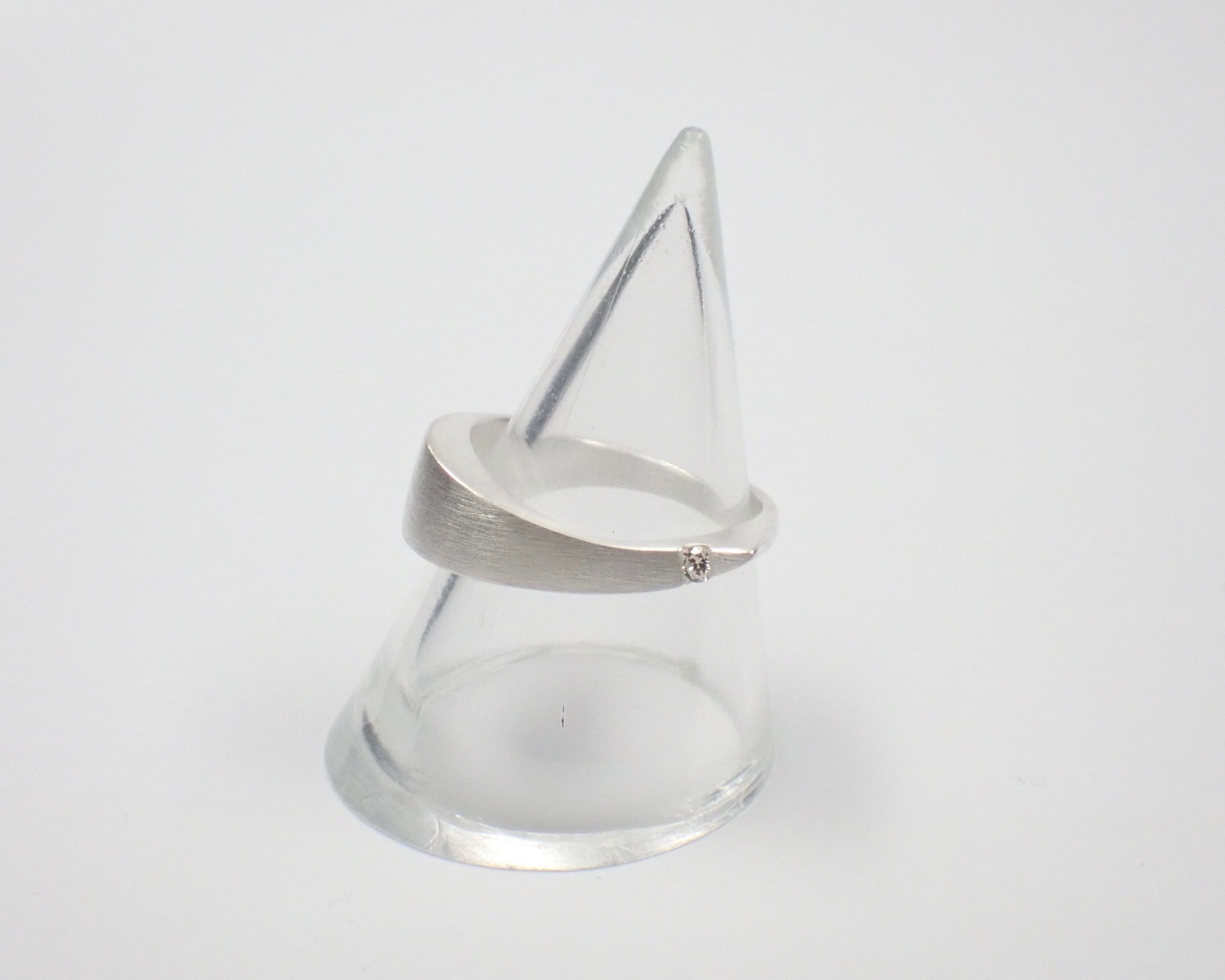 リングの太さと天然ダイヤで強弱をつけ、シンプルながらも個性的なデザインに仕上がっています。